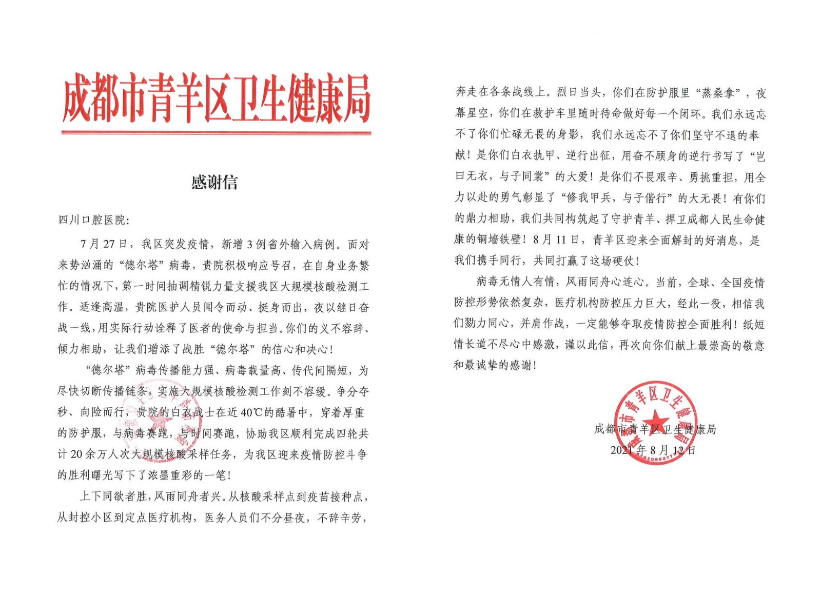 近日,四川口腔醫(yī)院收到一封來自成都市青羊區(qū)衛(wèi)生健康局特殊的感謝信。信中,區(qū)衛(wèi)生健康局對(duì)我院在“狙擊德爾塔”戰(zhàn)斗中積極表現(xiàn)表達(dá)了感謝,同時(shí)表示全國(guó)疫情防控形勢(shì)雖然依然復(fù)雜,但只要大家勠力同心,并肩作戰(zhàn),一定能夠奪取疫情防控全面勝利的信心和決心。
