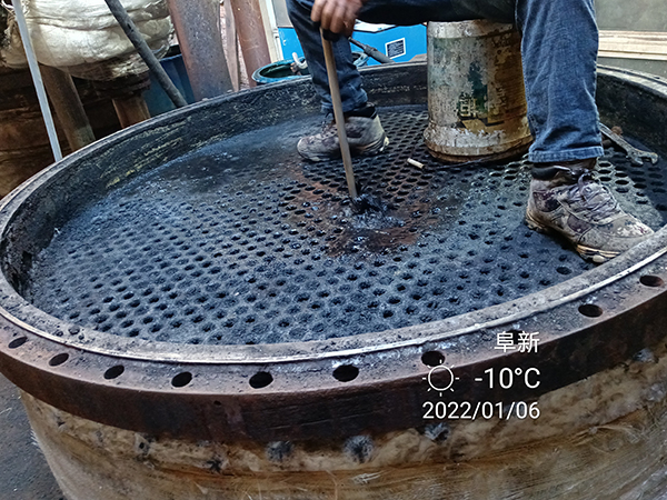 2022年1月24日星期一,虎年(農(nóng)歷臘月二十二)大寒季節(jié),室外時溫零下—16℃,遼寧省彰武縣興隆山鄉(xiāng)老虎坨子村,阜新市彰武縣達(dá)凱化工有限公司糠醛廠,在高經(jīng)理的精心安排下,蘇振山廠長給我們指導(dǎo),積極與我們河南都市機(jī)械設(shè)備有限公司喬俊陽技術(shù)員配合,改制了一款寬槽橡膠滑輪,對結(jié)垢堅(jiān)硬,徹底燒干堵死的廢水蒸發(fā)器管子進(jìn)行疏通,清理,經(jīng)過實(shí)驗(yàn),既節(jié)省了人力,又安全,又快捷,確實(shí)是值得分享的好辦法!