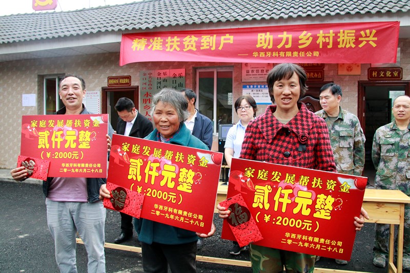 隨后,華西牙科扶貧工作組參加大坪村村委慶“七一”系列活動(dòng)。扶貧工作組為在衛(wèi)生評(píng)比活動(dòng)中獲獎(jiǎng)的村民頒發(fā)了獎(jiǎng)品,并為三戶還未脫貧的村民家庭發(fā)放了扶貧發(fā)展金,還為發(fā)展種植業(yè)農(nóng)戶購(gòu)買農(nóng)資提供了所需資金。大坪村村民們對(duì)幫扶工作組的到來(lái)表示熱烈歡迎,并對(duì)華西牙科的關(guān)心和幫助表示由衷地感謝。