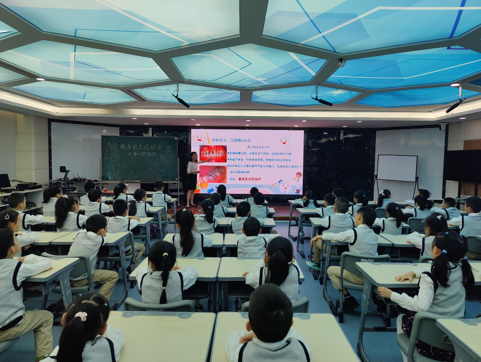 課堂上,重慶華西牙科工作人員通過(guò)生動(dòng)有趣的講解和形象的圖片展示,向同學(xué)們介紹了牙齒的結(jié)構(gòu)、功能以及常見(jiàn)的口腔問(wèn)題。通過(guò)實(shí)際操作與講解相結(jié)合的方法,現(xiàn)場(chǎng)示范了正確的刷牙方法,讓同學(xué)們更直觀地掌握了口腔護(hù)理的技巧。同學(xué)們聽(tīng)得津津有味,積極參與互動(dòng),紛紛舉手提問(wèn)?,F(xiàn)場(chǎng)工作人員耐心地解答了同學(xué)們的問(wèn)題,告訴孩子們?nèi)绾握_刷牙、如何選擇合適的牙刷和牙膏,以及飲食習(xí)慣對(duì)口腔健康的影響。課程結(jié)束后,新村實(shí)驗(yàn)小學(xué)瞿爍校長(zhǎng)為重慶華西牙科工作人員頒發(fā)了最佳課堂獎(jiǎng)牌。